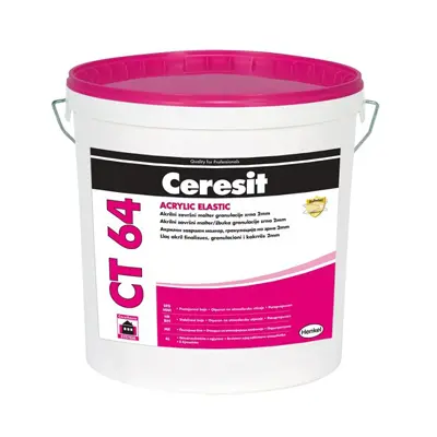CERESIT CT 64 je dekorativni tankoslojni akrilni malter zaribane strukture za unutrašnju i spoljašnju upotrebu. Pogodan za termoizolacione sisteme na betonskim površinama, starim malterima, gipsanim podlogama i ivericama, gips-karton pločama i slično. Granulacija 2 mm. Akrilni završni malter zaribane strukture.